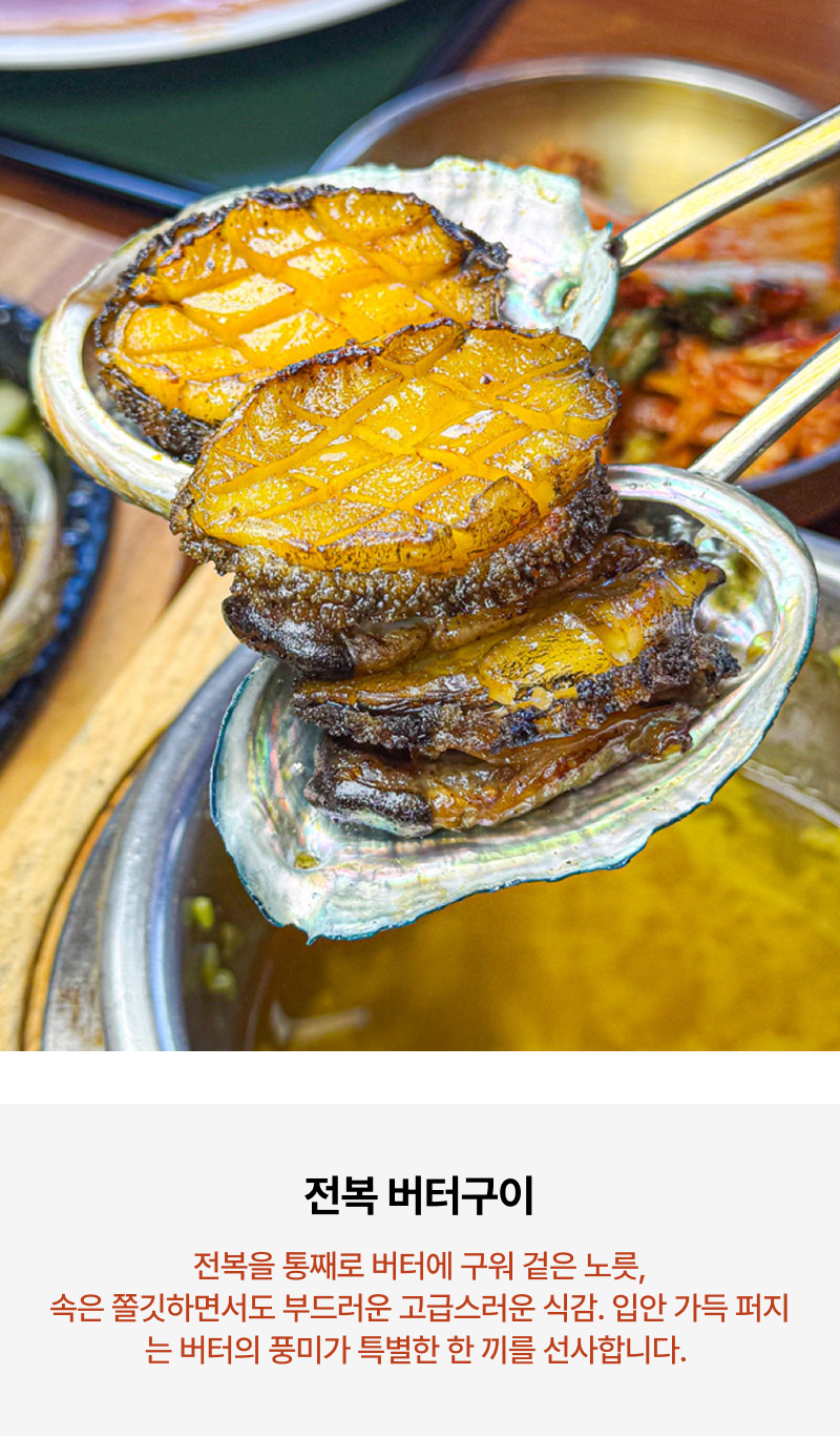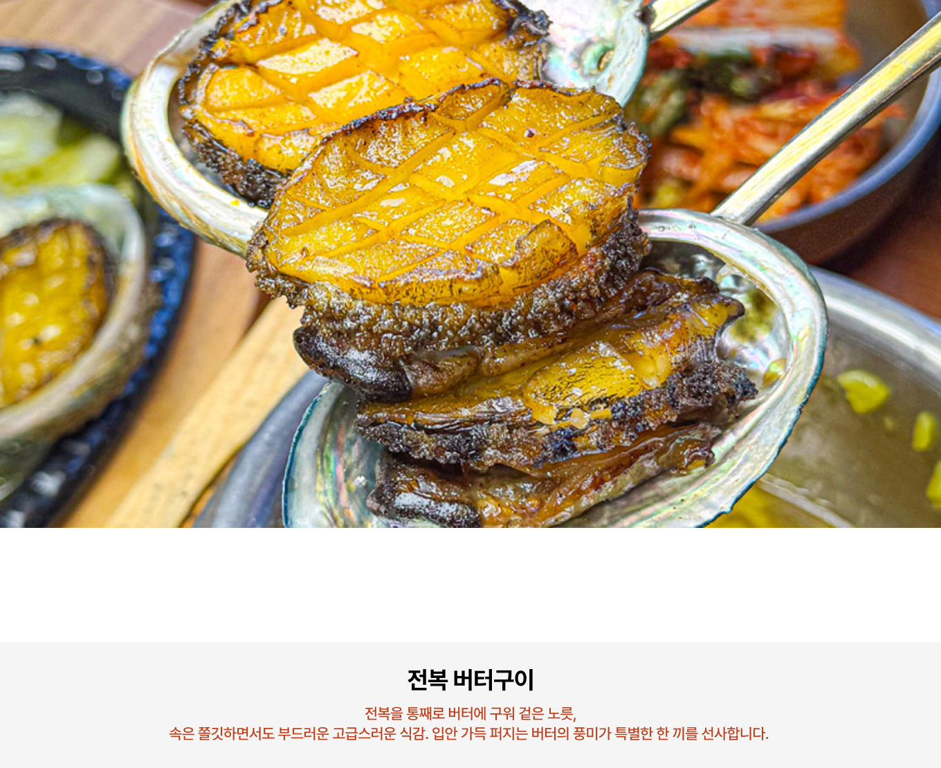 완도산 전복에 프리미엄 버터의 깊은 향을 더한 예담 전복버터구이. 정성과 품격을 담아 쫄깃한 식감과 진한 풍미를 완성했습니다.